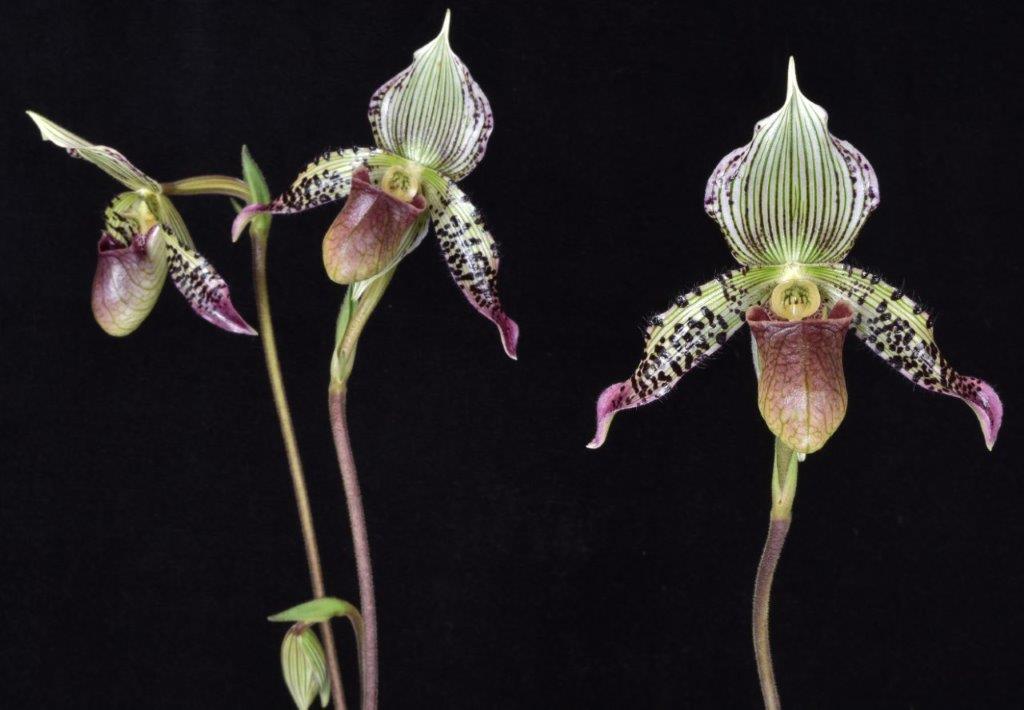 In this location we are able to specialize in intermediate temperature orchids. Our daily highs in summer are about 85 degrees with a 20 degree drop at night. in winter our highs are around 75 and 60 at night. These conditions allow us to specialize in our favorite orchids, Paphiopedilums, Phragmipediums, Angraecums and Lycaste.