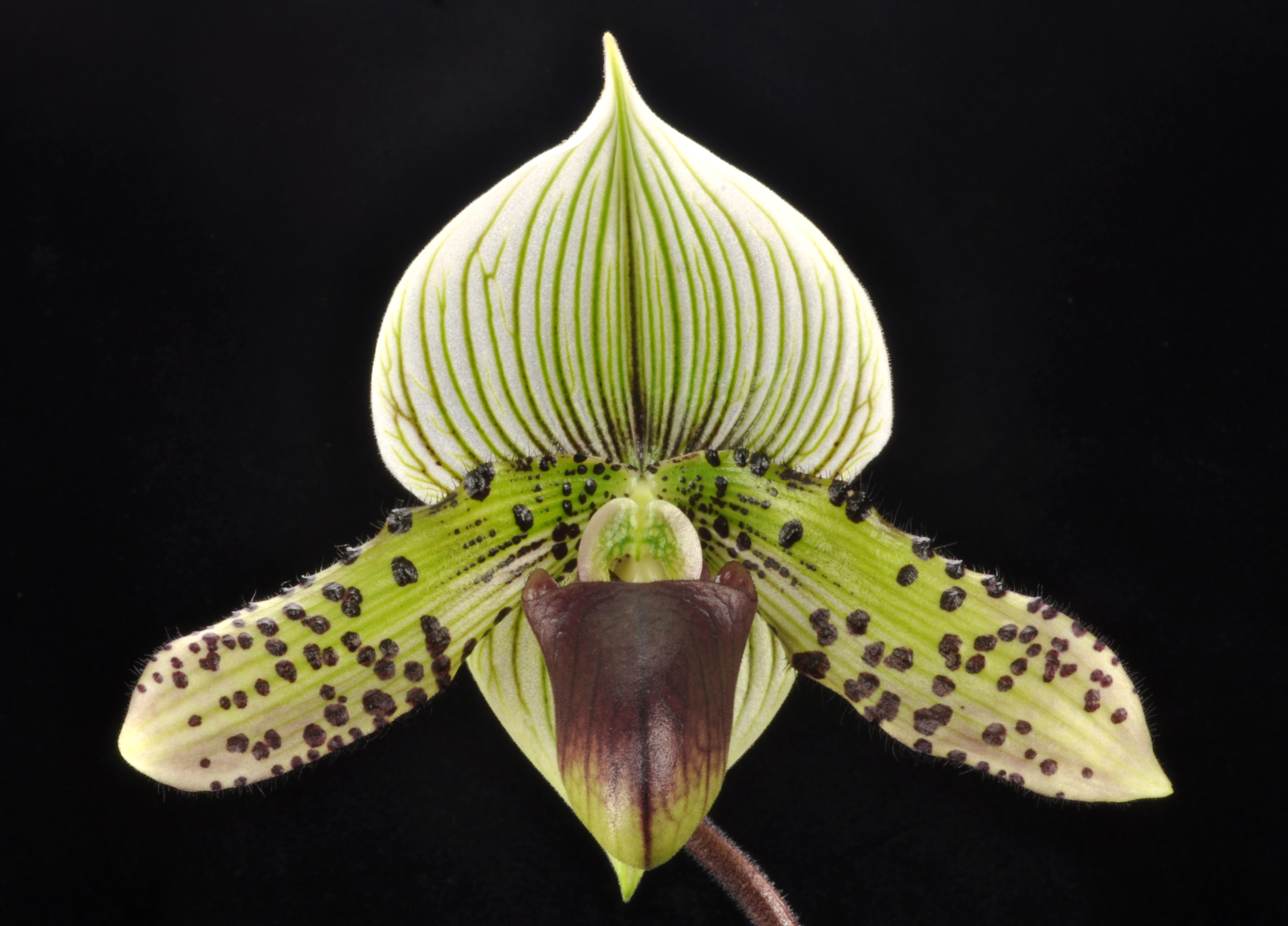 In this location we are able to specialize in intermediate temperature orchids. Our daily highs in summer are about 85 degrees with a 20 degree drop at night. in winter our highs are around 75 and 60 at night. These conditions allow us to specialize in our favorite orchids, Paphiopedilums, Phragmipediums, Angraecums and Lycaste.