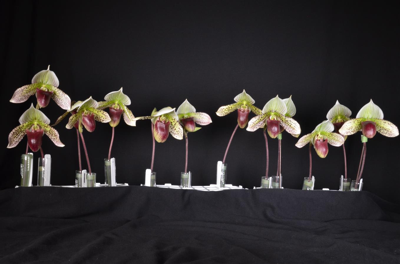 In this location we are able to specialize in intermediate temperature orchids. Our daily highs in summer are about 85 degrees with a 20 degree drop at night. in winter our highs are around 75 and 60 at night. These conditions allow us to specialize in our favorite orchids, Paphiopedilums, Phragmipediums, Angraecums and Lycaste.
