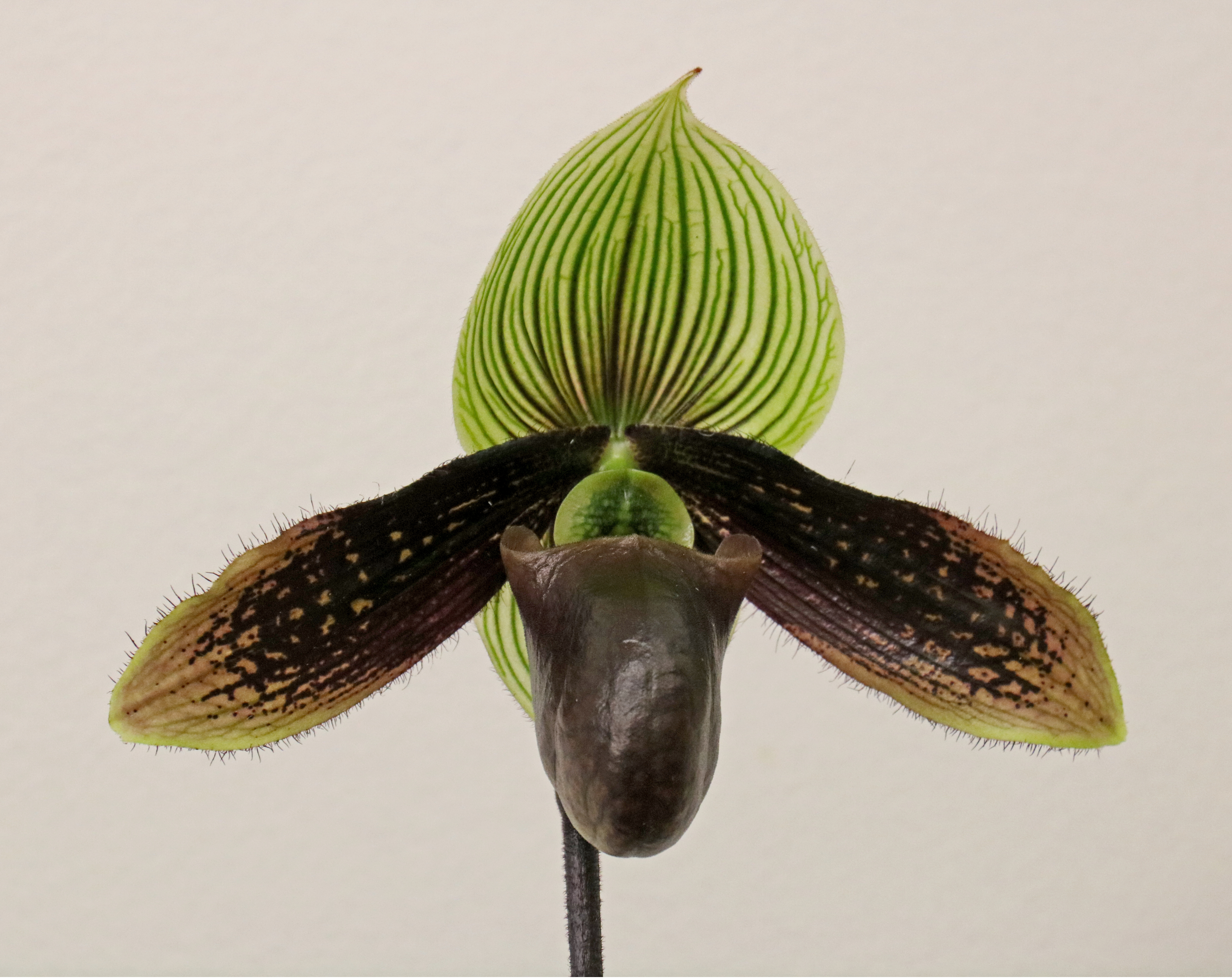 In this location we are able to specialize in intermediate temperature orchids. Our daily highs in summer are about 85 degrees with a 20 degree drop at night. in winter our highs are around 75 and 60 at night. These conditions allow us to specialize in our favorite orchids, Paphiopedilums, Phragmipediums, Angraecums and Lycaste.