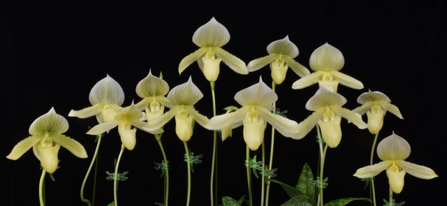 In this location we are able to specialize in intermediate temperature orchids. Our daily highs in summer are about 85 degrees with a 20 degree drop at night. in winter our highs are around 75 and 60 at night. These conditions allow us to specialize in our favorite orchids, Paphiopedilums, Phragmipediums, Angraecums and Lycaste.