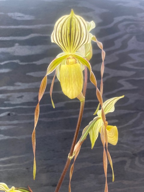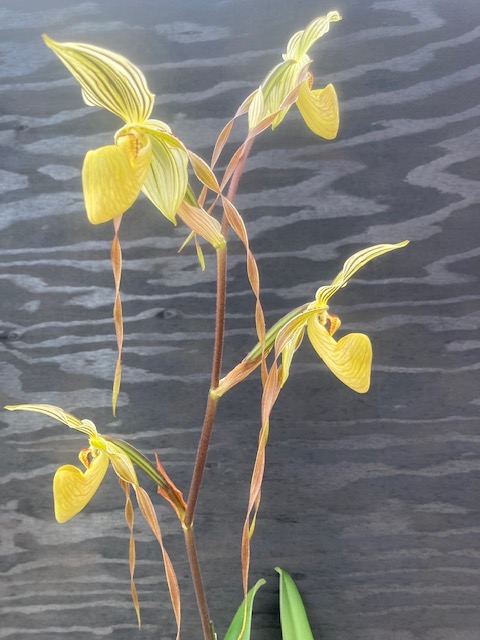 We remade this very popular hybrid with the objective of lightening the color of the flowers. These came out of flask April 2019 but are already as big as our Crouching Tiger from the previous time we made this hybrid. One from the previous time is shown here in the photograph. We are right, these are blooming size. The first to bloom opened in December 2022. However it is the traditional color.